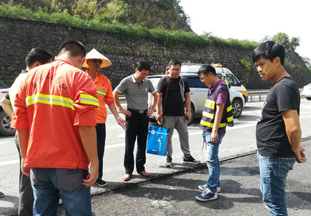 圖為集團總工程師江輝與相關人員在現場協商病害處置方案 根據施工方反應,臨海南匝道段瀝青路面病害較為嚴重,江輝一行即刻邀請路面專項工程設計方共同到現場,仔細檢查瀝青路面病害情況,并根據病害程度,裂縫、車轍等情況協商確定相應的專項處置方案,以便更好地開展路面維修工作。