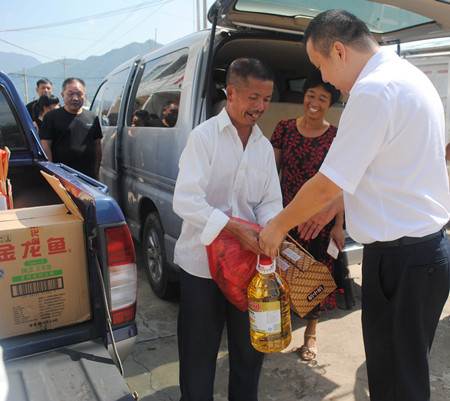 潘山頭村共有22戶困難戶,因時(shí)間關(guān)系,臺(tái)州收費(fèi)所黨支部一行走訪了其中3戶困難家庭,對(duì)于其他19戶困難家庭委托該村“兩委”領(lǐng)導(dǎo)代為慰問(wèn)。每到一戶,支部書記王小勇都詳細(xì)詢問(wèn)了解困難群眾的生活情況,勉勵(lì)他們積極面對(duì)生活,戰(zhàn)勝困難,同時(shí)為他們送去了中秋月餅、食用油、干果等慰問(wèn)品及節(jié)日問(wèn)候。