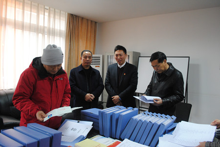 圖為評(píng)審專家正在查看相關(guān)臺(tái)帳