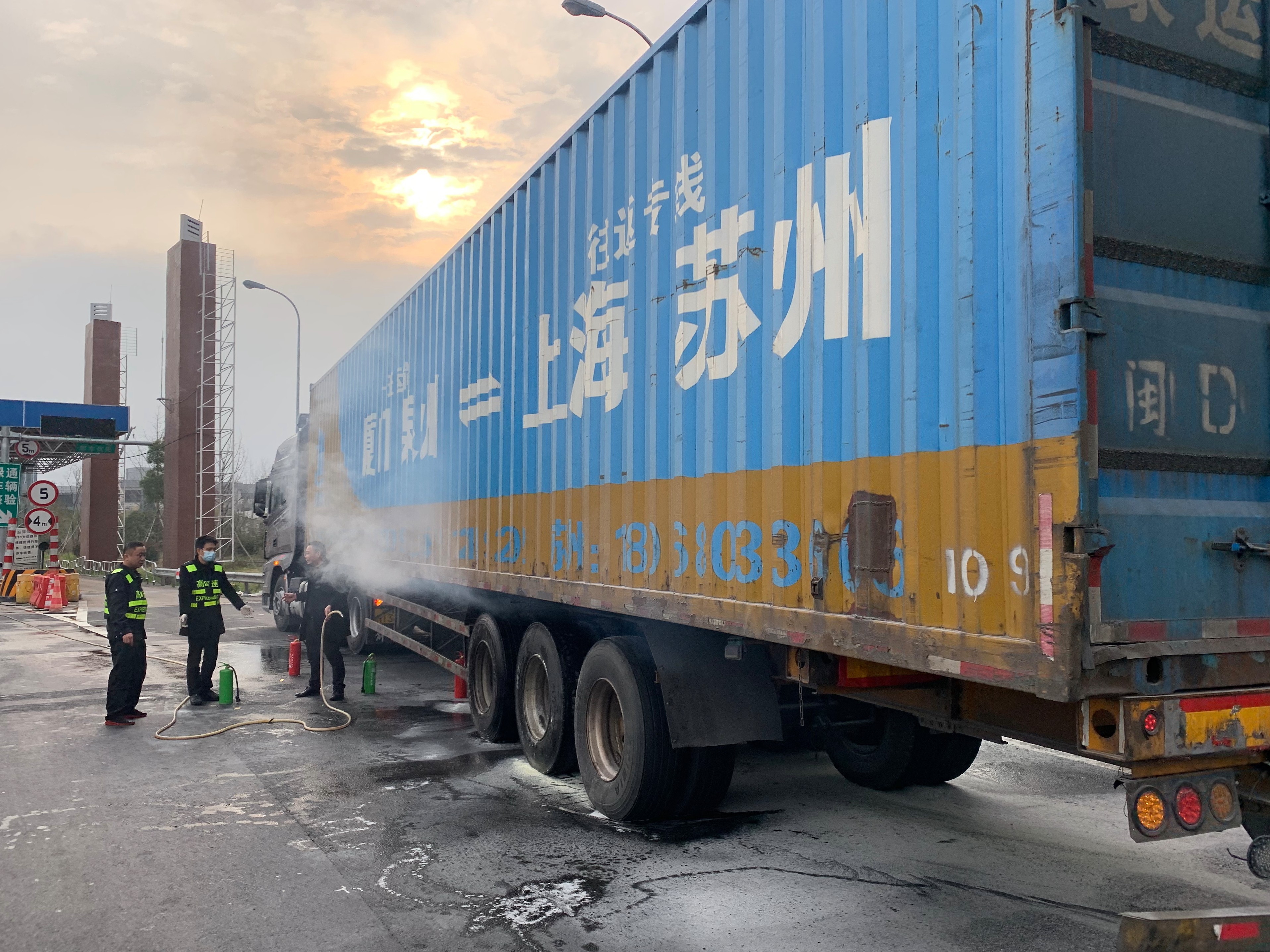 “嘭……”3月5日早上7:35分左右,臺州收費(fèi)所傳來一聲巨響,一輛車牌“閩”字開頭的大貨車緩緩駛來,其車廂后輪胎正冒火光,隨之白煙滾滾升起,駕駛員卻渾然不知,一路行駛。