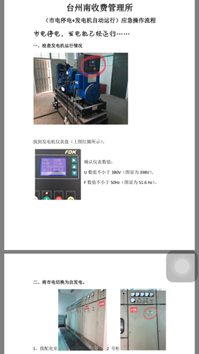 “當市電斷開,聽到發電機響起時,只需用扳手把切換銷控切換到自發電,然后按一下各區域的用電開關即可,喏,就這幾個關鍵開關……” 近日,臺州南收費所的兼職電工金小斌在配電房耐心對前來學習自發電操作的員工作現場講解,“另外,操作過程中要有安全意識,碰到異常情況停止操作。”