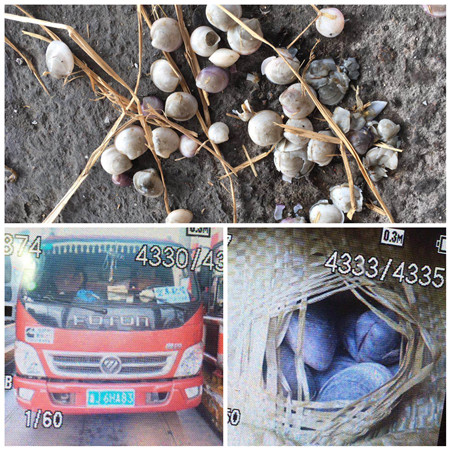 11月2日上午10:39分左右,車牌為浙J6HA83的小貨車駛入溫嶺西收費所2號崗亭,該車駕駛員稱自己運載的貨物為綠農產品,要求免費,堵塞車道一個多小時。最后在取證報警下,駕駛員交付通行費320元。 該車被篷布包著,車上貨物又被袋子緊緊包著。當工作人員要求檢查取證時,駕駛員只摳開指定的袋子,并且口子開得非常小,只讓人隱約看到貨物是貝殼。工作人員按規定要求駕駛員打開另一處取證,駕駛員以貨物被繩子綁著不好打開為由,只在前端把袋子摳了一個比硬幣大點的小洞,拿出幾個貝殼,工作人員看到其拿出的貝殼不管是在大小還是顏色上,都和他剛才指定的那袋貨物有明顯區別,于是工作人員親自用手摸進去查驗,經仔細檢查,貨物屬于貝殼中的殘次品,懷疑是飼料用途。