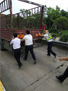 2018年5月27日,這本來是平凡普通的一天,可因為這件事,變成了不一樣的一天。 這一天,溫嶺西高速路收費員洪燈杰像往常一樣,在一號超寬車道旁的收費亭里工作。一輛綠色汽車剛走不久,卻發(fā)現(xiàn)后面一輛12軸型的小貨車停在那里,一動不動。洪燈杰心生疑惑,于是趕緊走出收費亭,到小貨車跟前查看。原來,這輛車剛走到收費站面前,便耗盡了電量,發(fā)動不了了。正在司機焦頭爛額之時,班長湯明漲和其他收費員吃飯回來,看見了這一幕。 湯明漲簡單地詢問了洪燈杰事情的經(jīng)過,本來準備等拖車,可是現(xiàn)在正是中午車輛高峰期,加上五號車道在施工,等拖車不合適。如果導(dǎo)致一號車道堵車,切換成ETC也緩解不了。考慮到這些問題之后,湯班長決定叫來幾個“大力士”,幫忙推車。