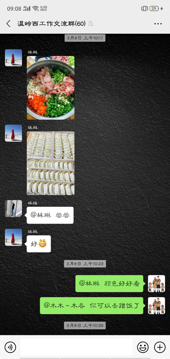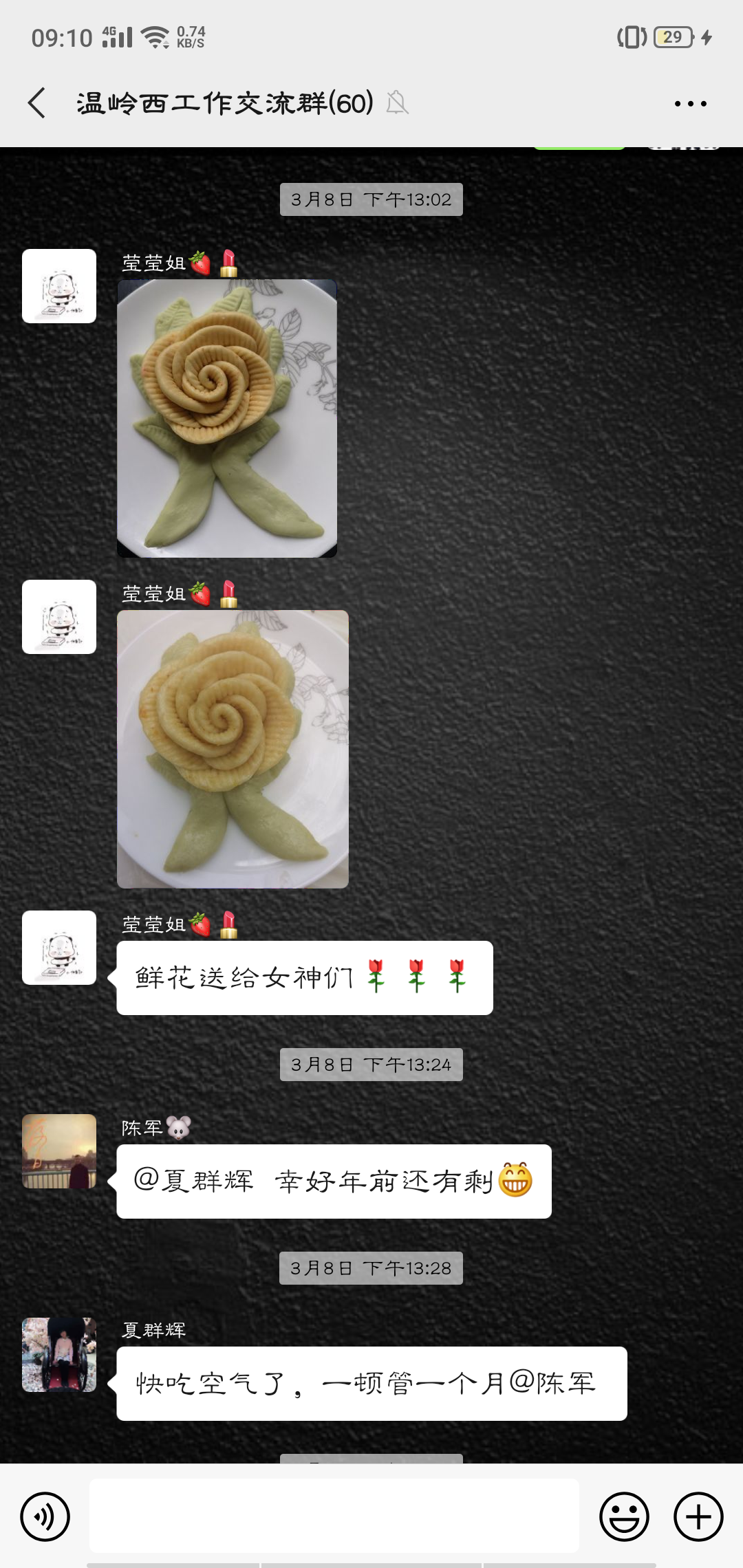活動(dòng)中,大家的參與性都很高,紛紛在微信群內(nèi)曬出自己制作的美食:鹽焗雞、可樂雞翅、蔥油角角魚、溫嶺小吃豬肉飯、玫瑰南瓜饅頭……紛紛亮出了自己的拿手好菜,在群里談?wù)摰脽峄鸪斓耐瑫r(shí),也不忘介紹一下自己做的菜。甚至很多男同事也紛紛曬出自己的最佳廚藝,祝福女同胞節(jié)日快樂。
