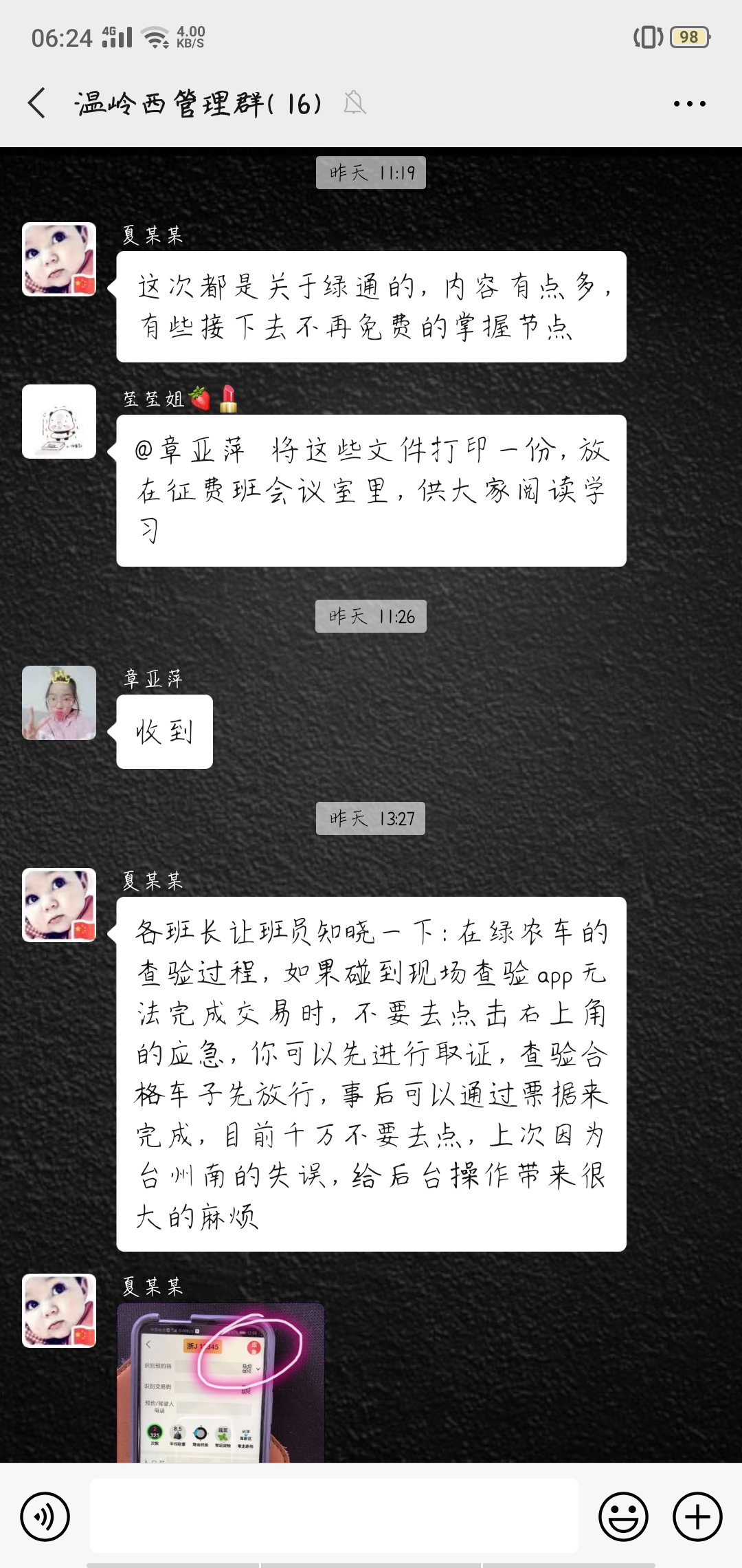圖為需要學(xué)習(xí)的各個(gè)文件內(nèi)容 培訓(xùn)采取集中學(xué)習(xí)與線上學(xué)習(xí)相結(jié)合,理論知識(shí)與現(xiàn)場(chǎng)操作相結(jié)合、互動(dòng)交流與相互提問(wèn)相結(jié)合的方式開(kāi)展,通過(guò)釘釘、微信等學(xué)習(xí)平臺(tái),每天,各班班長(zhǎng)組織班員開(kāi)展崗前五分鐘提醒、崗后班組集中學(xué),確保每一名收費(fèi)人員能夠熟練掌握新收費(fèi)系統(tǒng)的各項(xiàng)操作流程。此外,各班班長(zhǎng)及時(shí)梳理匯總收費(fèi)員們?cè)趯?shí)際操作中遇到的問(wèn)題,并上傳至管理群,群中全員參與,一起討論學(xué)習(xí)。遇到無(wú)法解決的問(wèn)題時(shí),所負(fù)責(zé)人第一時(shí)間與上級(jí)主管部門(mén)溝通,以尋求最佳解決方案,并發(fā)布到群里,明確操作流程和統(tǒng)一相關(guān)政策解釋工作。 本次培訓(xùn)不僅使全所每一位員工鞏固了前期業(yè)務(wù)知識(shí),也更加深入掌握了收費(fèi)新系統(tǒng)的操作流程以及新收費(fèi)政策,為恢復(fù)正常收費(fèi)穩(wěn)步進(jìn)行奠定了堅(jiān)實(shí)的基礎(chǔ)。 鄭霞霞