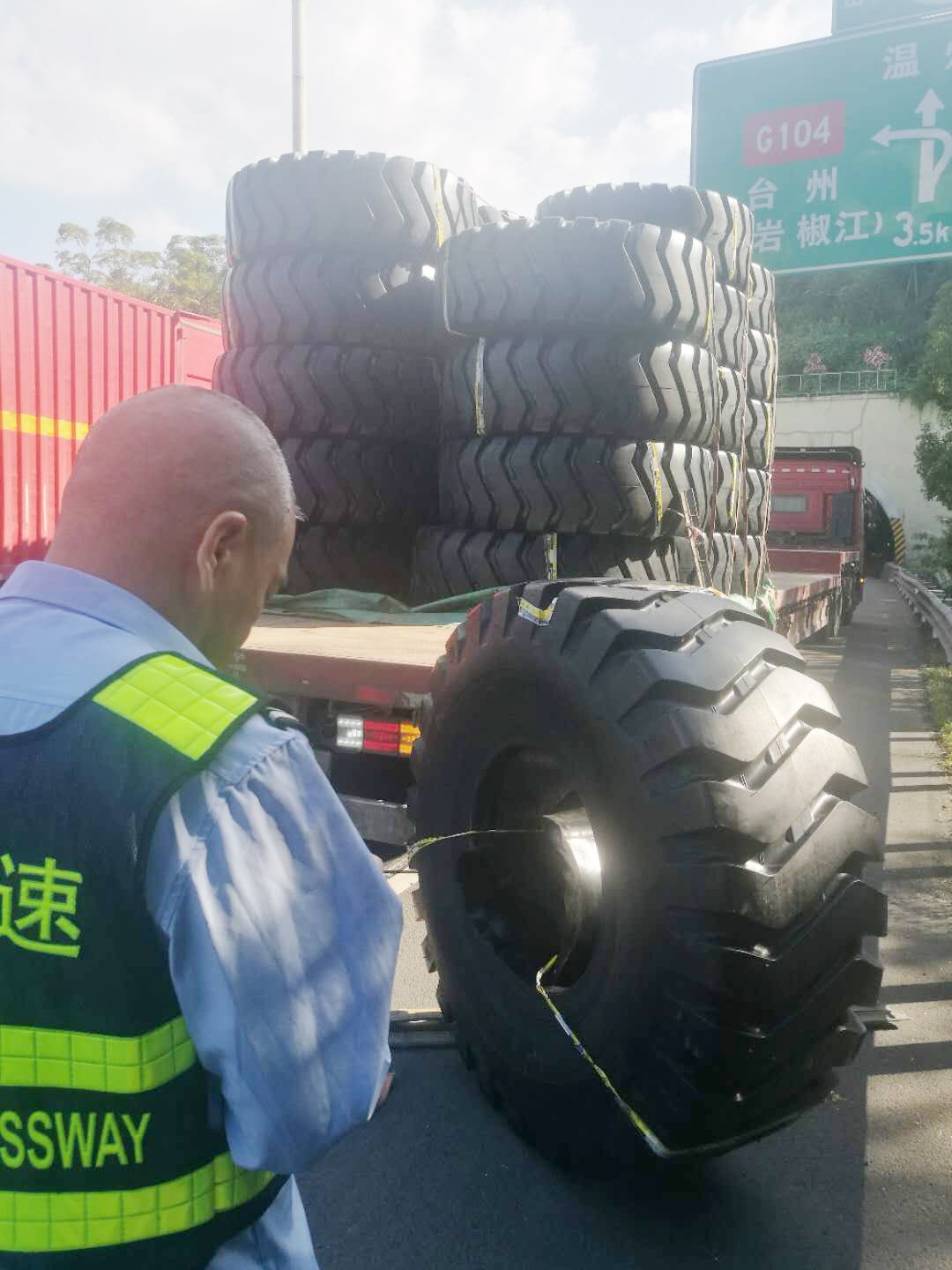 執(zhí)勤隊接警后立即趕往事故地點,一輛運載輪胎的貨車停靠在主車道,其中一個巨型輪胎滑落到硬路肩上,致使后方車輛紛紛避讓。為及時消除險情,執(zhí)勤隊快速在現(xiàn)場做好安全警戒工作,同時將現(xiàn)場情況反饋給監(jiān)控中心。由于貨車綁繩索松動,重達300多斤的輪胎脫落在地,隨后執(zhí)勤隊協(xié)同施救中心、駕駛?cè)?/span>員合力將掉落的輪胎先拖至車旁,經(jīng)過長達半個小時的搶險,跌落的貨物終于完好無缺地回到貨車上,道路恢復(fù)暢通。 筆者溫馨提醒:在高速公路行駛過程中,駕駛?cè)藨?yīng)注意將車上的貨物固定好,途中要隨時注意貨物及捆綁繩索是否松動。無論是車輛撒落物還是人為拋灑物,都會給道路安全暢通埋下了重大隱患! 林玲