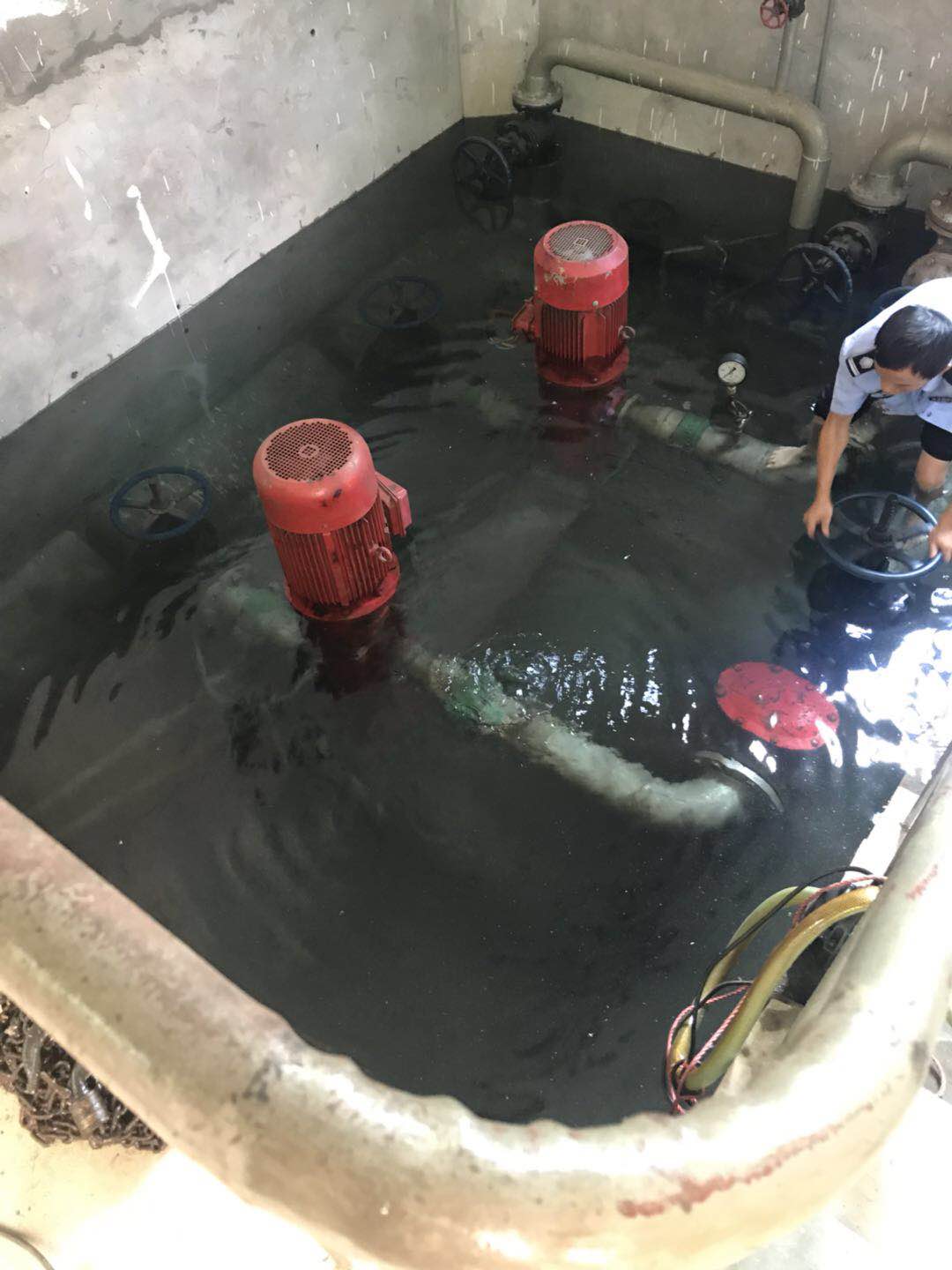 圖為執勤隊員在關閉閥門 “看,應該是這里漏水了,有水暈在動。” “對,就是這里了。” “水馬上要沒到電機了,趕快關閉閥門,不然損失就大了。” 此時,陳旦平沒有多想,立即下水去關閉水泵閥門。池中有2號泵的高位水池閥門和2號泵的集水池閥門,每個泵各有兩個閥門。陳旦平在迅速關閉閥門后,由于集水池這邊地勢較低,慌忙中的他忘拿手機,手機被水浸到,他卻依舊埋頭于搶修。 據隊長李新波說,此次“水災”是北泵房2號泵的壓力表處水管漏水,原因是設備設施使用時間較長,水管陳舊銹蝕,抵不住水壓,導致水管開裂,引起漏水。 胡瑰華