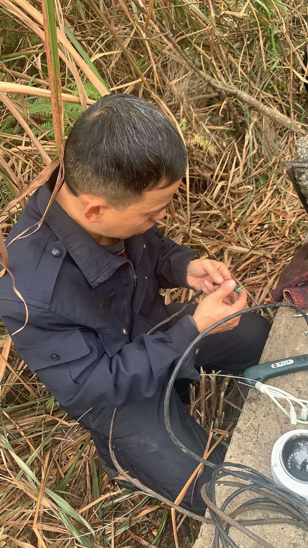 大溪嶺南高位水池地點在溫州地界,山體較高,攀行需要近一個小時,金所得知情況后,立即帶著執勤隊上山到高位水池檢查,他們背著工具箱,戴著手套、拿著柴刀,經過一個小時的披荊斬棘來到南高位水池的井口,金所爬到井里進行檢查,發現光纜和電線都被老鼠咬斷了,才導致圖像不能工作,當場把電線接了回去,并回所準備其他材料,明日再次登山修理。