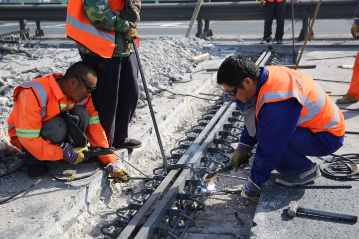 隨后,在伸縮縫型鋼安裝現(xiàn)場,陳文波撿起鑿除的碎渣,查看被鑿除的舊伸縮縫情況。公司所轄路段屬于軟土路基,且有91座橋梁,由于運(yùn)行時(shí)間已20余年,部分橋梁伸縮縫破損較為嚴(yán)重,如何維修橋梁伸縮縫和橋頭跳一直是個(gè)老大難問題。在橋梁伸縮縫修補(bǔ)現(xiàn)場,因?yàn)橹剀嚨哪雺海糠稚炜s縫已經(jīng)磨損嚴(yán)重,所在的混凝土路面只能借助鑿巖機(jī)進(jìn)行作業(yè)。