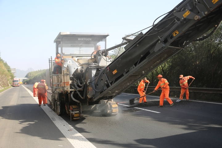 在黃土嶺北洞口附近的路面上,大型履帶式路面銑刨機(jī)銑削開一條寬度為2000mm的路面,散料隨之被迅速輸送到工程運(yùn)輸車上,路面銑刨工作流程有條不紊展開。