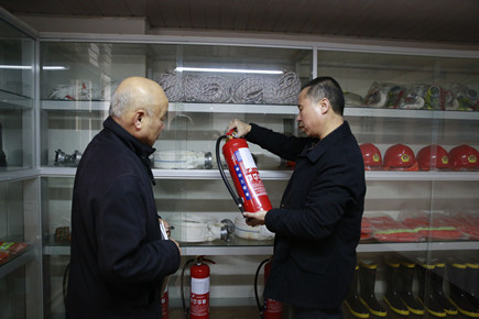 圖為安保部負(fù)責(zé)人在檢查滅火器