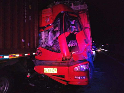 圖為被撞壞的ETC設(shè)備 當晚事故接連不斷。晚上22點40分,臺州收費所ETC進口處,一輛大客車行李車門撞歪顯示屏,同時也撞壞了一只抓拍攝像頭,造成了較大的路產(chǎn)損失,但是當班員工都正在路面上施救,施救中心領(lǐng)導統(tǒng)籌部署,通知兩位在所非當班人員赴崗上班,緊急出動,發(fā)揮連續(xù)作戰(zhàn)精神,進行及時處理。 當以上事故處理完畢,施救人員正準備往回趕的時候,當晚23點10分左右,四輛大貨車在寧向1667K+300M處連環(huán)追尾,其中一輛紅色大貨車車頭嚴重變形并且不斷向外漏油。現(xiàn)場極不安全,情況危急,施救中心員工馬不停蹄,又一次拉響了救援車的警報,為了爭取時間,甚至通知了另外地點待崗的人員火速趕來,以便能及早處理。此時,施救中心當班人員已經(jīng)全體出動,全部戰(zhàn)斗在路上。 王凱