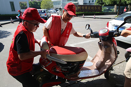 上圖為志愿者服務隊合力推離停放不規范的電瓶車、三輪車