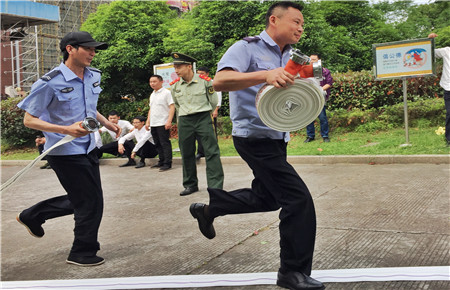 “趕快救火!”隨著教官一聲令響,比武正式開始。“消防員”們個個行動神速,鎮定地手持滅火器,拔掉保險銷,對準著火點壓下手把噴射,動作連貫一氣呵成。