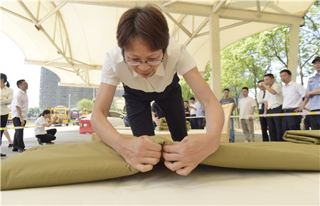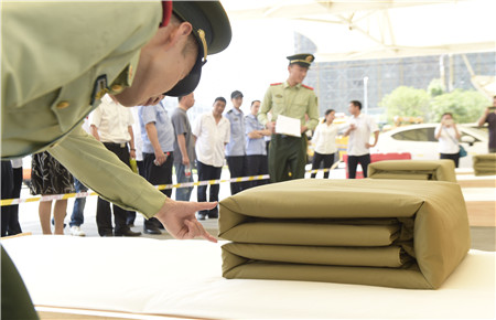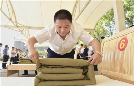圖為教官為各位選手的“豆腐塊”裁判打分 這是集團2018年技能大比武中內務項目比賽中的一個場景。此次內務比賽由公司大樓、所、中心、子公司共挑出33名代表參加,比賽特邀黃巖消防大隊兩位教官擔任裁判。