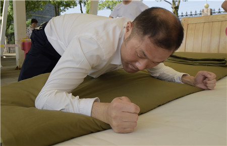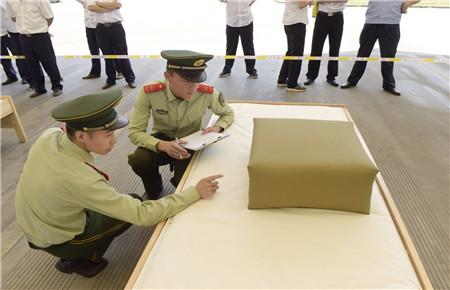 教官用手量量被子上下厚度,四周細細觀察,在兩床“豆腐塊”被子之間反復來回查看了幾遍,又與另一個教官指指點點商量了好久,不僅是參賽者,圍觀者都開始緊張了。確實,按照內務整理要求,這兩床已被疊成豆腐塊的被子折得有棱有角,被面光滑,上下勻稱,外行人看來就是一模一樣的完美,沒有任何區別了?!白屗麄兌紩x級吧?!迸杂^者說。教官笑著搖搖頭,對大家解釋道:“3號床勝出,因為它是雙面折法,在規定時間內兩面修整程度都一樣平整,這樣比起來,5號床稍遜一籌?!?/span>