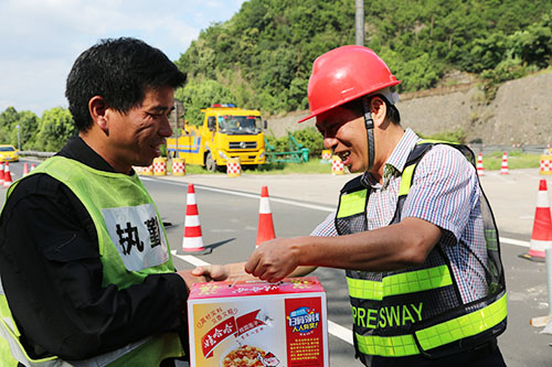 圖為集團總工程師江輝為交通疏導員送上慰問品 大溪嶺隧道溫向隧洞中,施工人員正在拆除原設備,除了噪音和洞中彌漫的灰塵,高溫高濕的環境也嚴重考驗著施工人員的身心。江輝提著慰問品,向隧洞中和烈日下正在崗位上工作的施工人員和交通疏導員送上慰問品。考慮到一線人員的特殊情況,江輝特別要求采購人員將送清涼物資改為八寶粥、蛋黃派、飲料等可以直接食用的物資,方便施工人員可以隨時補充能量。