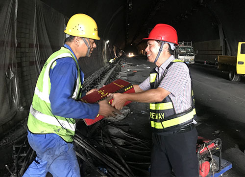 圖為集團總工程師江輝給隧道內施工人員送上慰問品