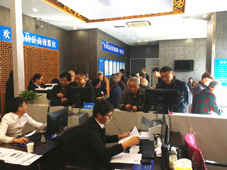 10月31日當(dāng)天,全市各收購點股東絡(luò)繹不絕,股東轉(zhuǎn)讓熱情高漲,場面尤其火爆。當(dāng)天下午,收購時間點過后,還有股東在收購點辦理轉(zhuǎn)讓手續(xù)。 李佩紅