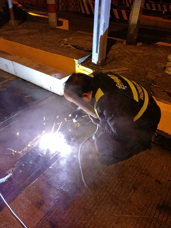 到了現(xiàn)場(chǎng),隊(duì)員發(fā)現(xiàn)該車(chē)道輪檢器鐵板螺孔由于不斷摩擦并逐漸變大,導(dǎo)致整顆螺栓脫離底下固定螺座,加之當(dāng)天是春節(jié)高速免費(fèi)第一天,車(chē)輛經(jīng)過(guò)時(shí)車(chē)速都較快,直接將整塊鐵板帶離底座。如果不及時(shí)對(duì)鐵板進(jìn)行加工恢復(fù),不僅不能保護(hù)下面的輪檢器,而且還有可能造成車(chē)輛爆胎。可除夕夜全部加工廠都已關(guān)門(mén),如果讓廠家發(fā)貨至少也要好幾天。正在兩難之際,中心副經(jīng)理葉俊想到將鐵板與底座邊緣直接焊死的臨時(shí)應(yīng)急方法,待節(jié)后再向廠家定制或重新購(gòu)買(mǎi)。 方案有了,大家兵分兩組,一組去中心倉(cāng)庫(kù)拿電焊機(jī)、電焊條等設(shè)備,一組待在原地清理鐵底下方於泥等雜物,為隨后的電焊工作做準(zhǔn)備。設(shè)備到位后,葉俊一手操起電焊罩,一手熟練的將電焊條點(diǎn)在了鐵板與底座邊緣之間,經(jīng)過(guò)近一個(gè)小時(shí)的處理,輪檢鐵板與地面底座牢牢地固定在一起,再也不用被飛馳而過(guò)的車(chē)輛帶離。 項(xiàng)寅曉