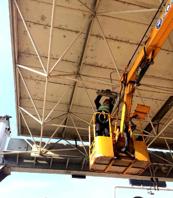 圖為隊(duì)員正在更換車道頂棚燈 期間在臺(tái)州南收費(fèi)所發(fā)現(xiàn)有兩個(gè)車道出現(xiàn)異常,即當(dāng)重型車輛通過(guò)時(shí),輪檢鐵板和稱臺(tái)出現(xiàn)不正常晃動(dòng)情況。根據(jù)以往經(jīng)驗(yàn),此情況如不進(jìn)行及時(shí)維修,對(duì)車輛計(jì)重將造成嚴(yán)重影響。對(duì)此,技術(shù)人員不僅對(duì)鐵板上每顆螺栓都進(jìn)行了認(rèn)真細(xì)致的重新加固,之后不厭其煩對(duì)每個(gè)稱臺(tái)限位都進(jìn)行了多次調(diào)整,直至將晃動(dòng)幅度控制在正常范圍內(nèi)。