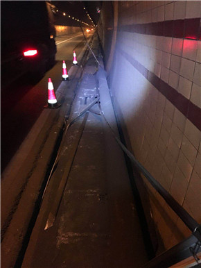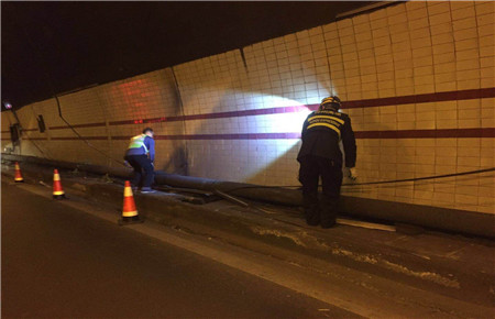 此時此刻,維養(yǎng)中心值班同志已經(jīng)馬不停蹄地奔往現(xiàn)場,中心負責(zé)人從臨海速度趕往現(xiàn)場。經(jīng)檢查,掛落電纜系汽通門控制線,不影響隧道內(nèi)照明、通訊系統(tǒng)的正常運行。當機立斷,決定采取臨時加固的緊急措施,及時聯(lián)系協(xié)調(diào)交警部門,請求封道施工的幫助和支持。