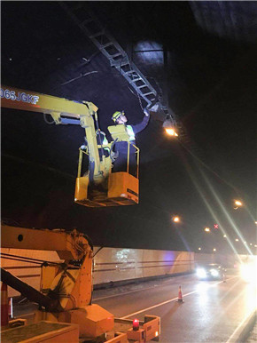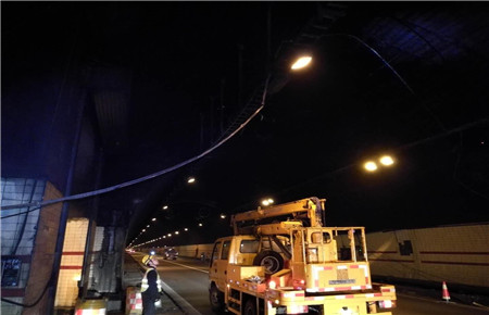 “南廣場有大貨車報警,據(jù)說發(fā)生事故……”4月17日凌晨3時55分,大溪嶺隧道中控室接到了臺州監(jiān)控中心緊急來電,執(zhí)勤隊立即驅(qū)車趕赴現(xiàn)場查勘。 巡邏車到達南廣場后,執(zhí)勤隊員發(fā)現(xiàn)溫向隧道進洞1公里處,隧道頂部的攝像頭被撞損,造成電纜橋架移位,電纜下垂橫跨車道,存在嚴重安全隱患。事發(fā)突然,執(zhí)勤隊員立刻做好安全預(yù)警措施,同時聯(lián)絡(luò)集團工程養(yǎng)護部機電維養(yǎng)中心,請求支援開展緊急搶修。