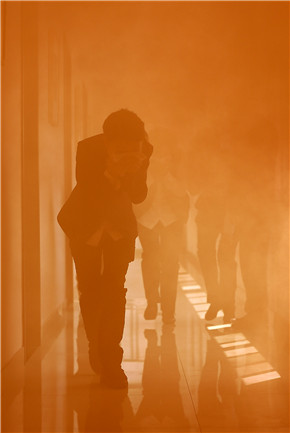該演練模擬了生活樓發生火災,員工一發現火情就立即撥打了報警電話。參加演練人員聽到警報聲后,迅速拿起打濕的毛巾捂住口鼻,手扶墻體或樓梯扶手,俯身低姿從三樓或二樓,向安全通道有序撤離。全體人員不一會就疏散到了安全地帶,同時連接好消防水帶,迅速跑至火源附近,對準火源有效滅火。