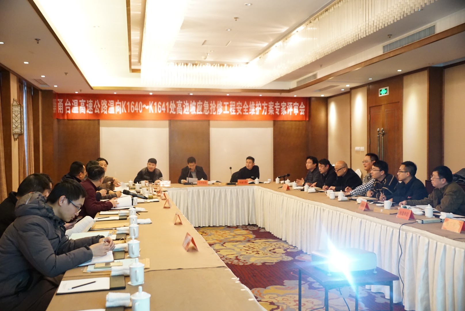 甬臺溫高速公路K1640-K1641處高邊坡應急搶險工程 安全維護方案評審會召開 3月6日下午,集團組織召開甬臺溫高速公路K1640~K1641處高邊坡應急搶險工程安全維護方案評審會。集團總工程師江輝主持會議。臺州市公路局、高速交警、施工、監理、設計、封道公司、隧道所、安保部等單位、部門和特邀專家參加會議。