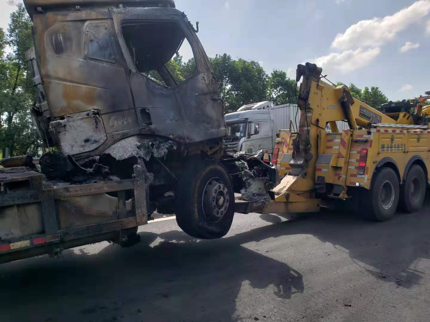 大火在現(xiàn)場(chǎng)留下了幾乎成為殘骸的兩輛車、滿地的油污、車輛碎片、燒剩下的布匹,一股刺鼻的臭味一公里外都聞得到。油污讓路道變得又膩又滑。更為嚴(yán)重的是,隨著時(shí)間的推移,從事故點(diǎn)開始,堵車開始一公里一公里的蔓延,幾乎快到了臺(tái)州收費(fèi)所。