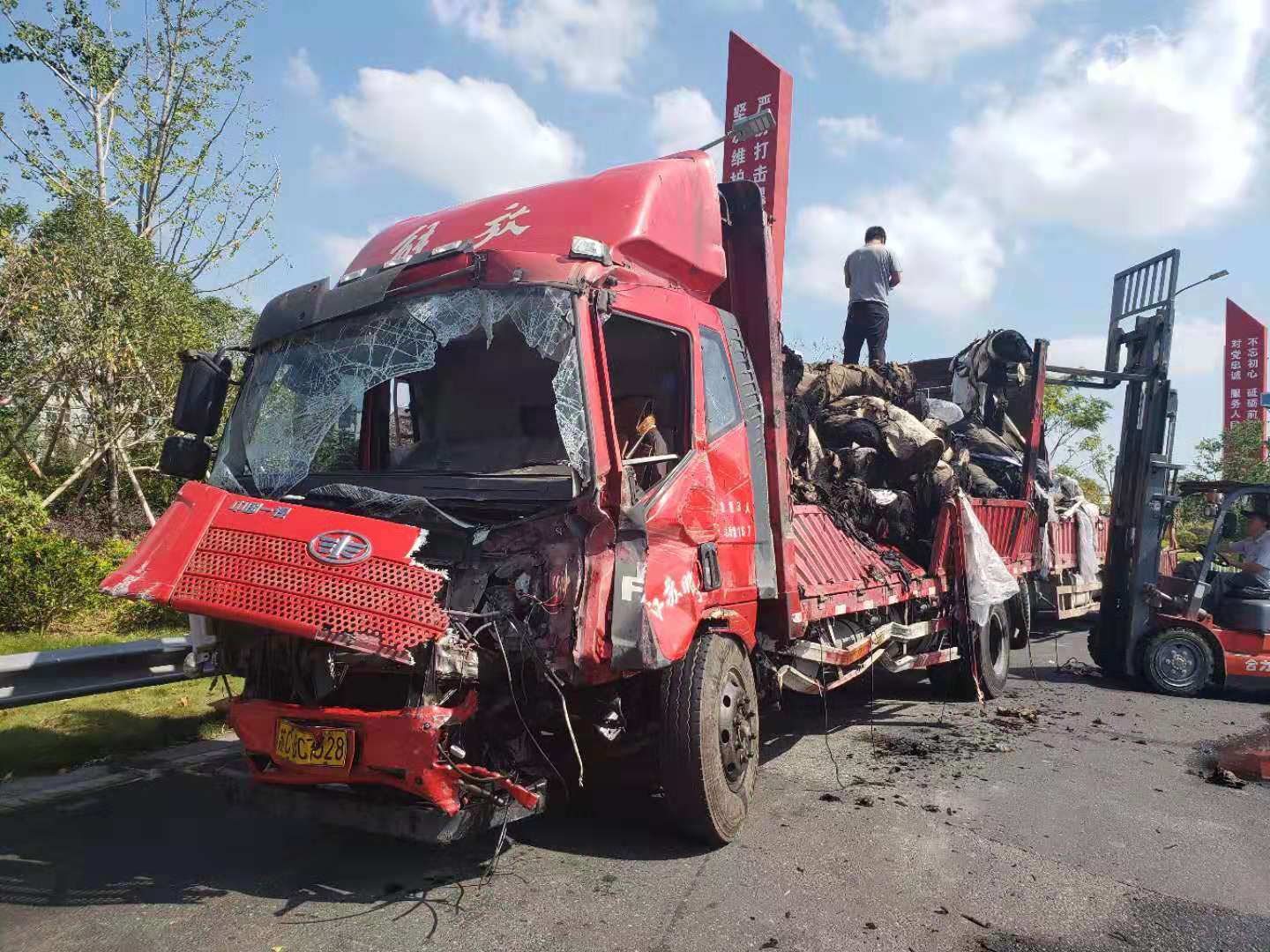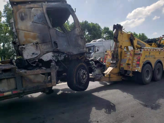 備勤的駕駛員毛慶榮顧不上刷牙洗臉,駕駛著大型救援車從臺(tái)州所出發(fā)。因?yàn)橛新樊a(chǎn)損失,當(dāng)晚住勤的值班人員王凱也駕駛著路產(chǎn)勘查車趕赴現(xiàn)場(chǎng)。
