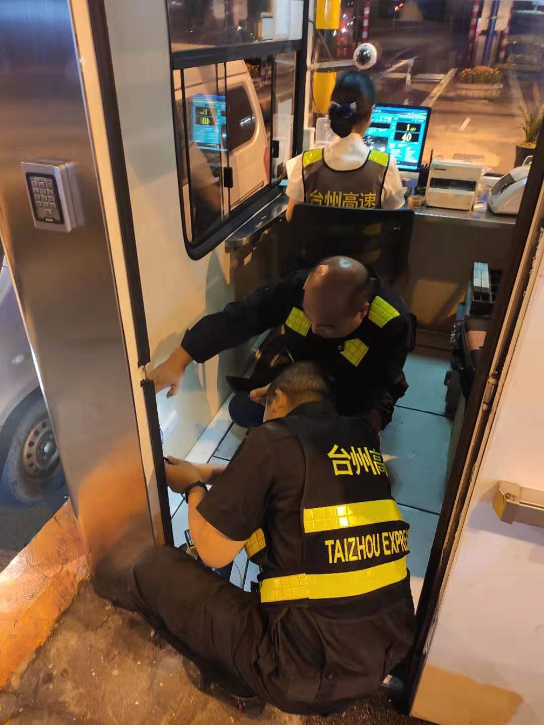 圖為工作人員在檢修崗亭設備