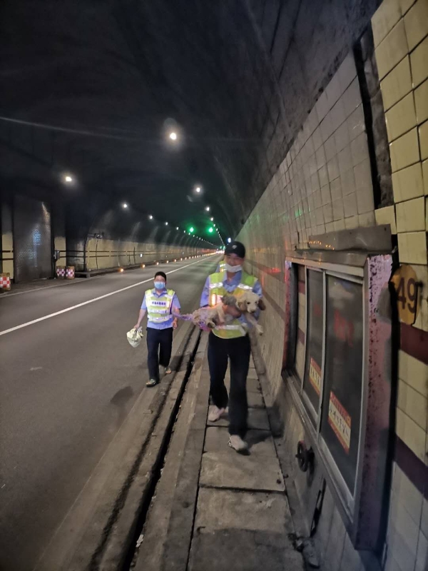 為確保安全,執勤隊員們帶上手套,拿著掃把和麻袋,到達現場后發現是一只白色的拉布拉多犬,它一動不動地趴著,可憐巴巴地看著隧道里的車子極速而過,很顯然小狗感覺到害怕,知道趴在這里才是最安全的。隧道所安保人員陶文輝再三確認小狗沒有攻擊意圖后,試著慢慢靠近它,給它喂食香腸,并耐心安撫,直至順利地將其抱起,帶上了巡邏車。狗是靈性的動物,認準了第一個抱起它的陶文輝,乖乖地依偎在他的懷里。 此前,隧道里從未出現寵物狗被遺忘的事,執勤隊長忙回到監控室查看錄像,準備幫它尋找主人,經過仔細查找終于發現隧道里有過一次大堵車,小狗就是那個時候被主人遺忘的。按照時間推算,這條小狗已經在隧道里呆了近14個小時,還好它聰明,趴在那兒一動不動沒有到處亂跑。最后經過半個多小時的查找,隊長終于與車主取得聯系,晚上22點左右,車主來到大溪嶺隧道所認領,多次感謝我們對小狗的救援和照顧。 孫鵬