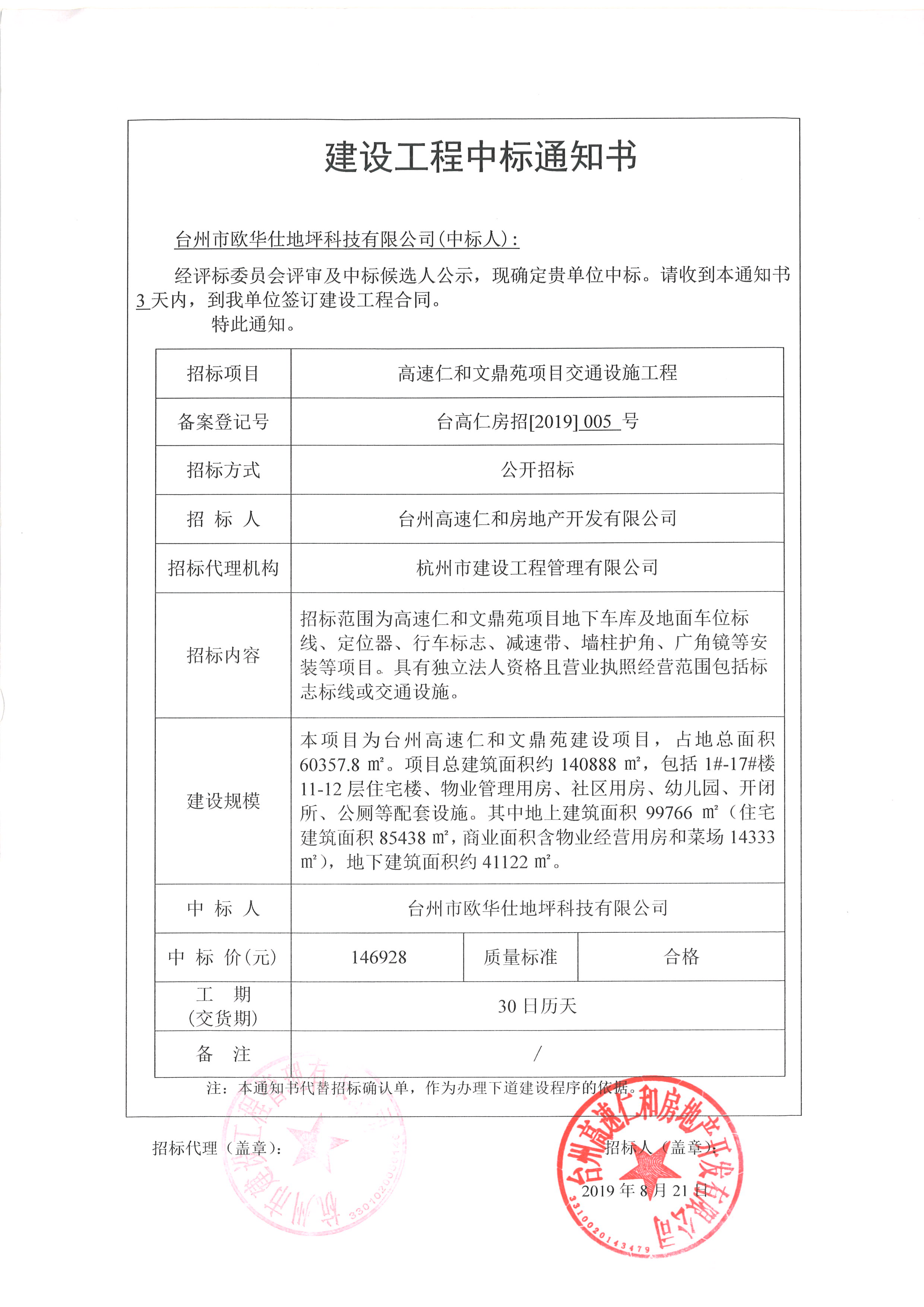 高速仁和文鼎苑項目交通設施工程中標通知書