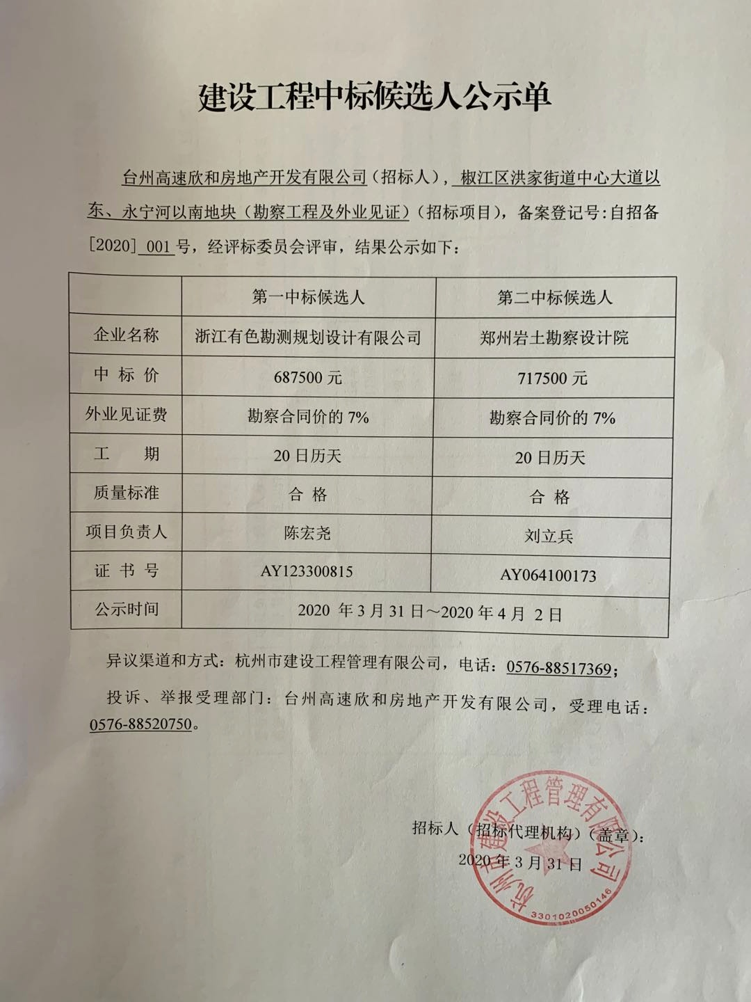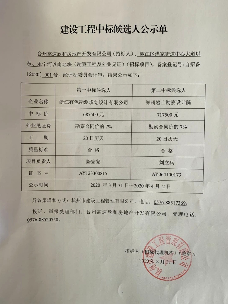 椒江區(qū)洪家街道中心大道以東、永寧河以南地塊(勘察工程及外業(yè)見證)(招標(biāo)項目)中標(biāo)候選人公示單