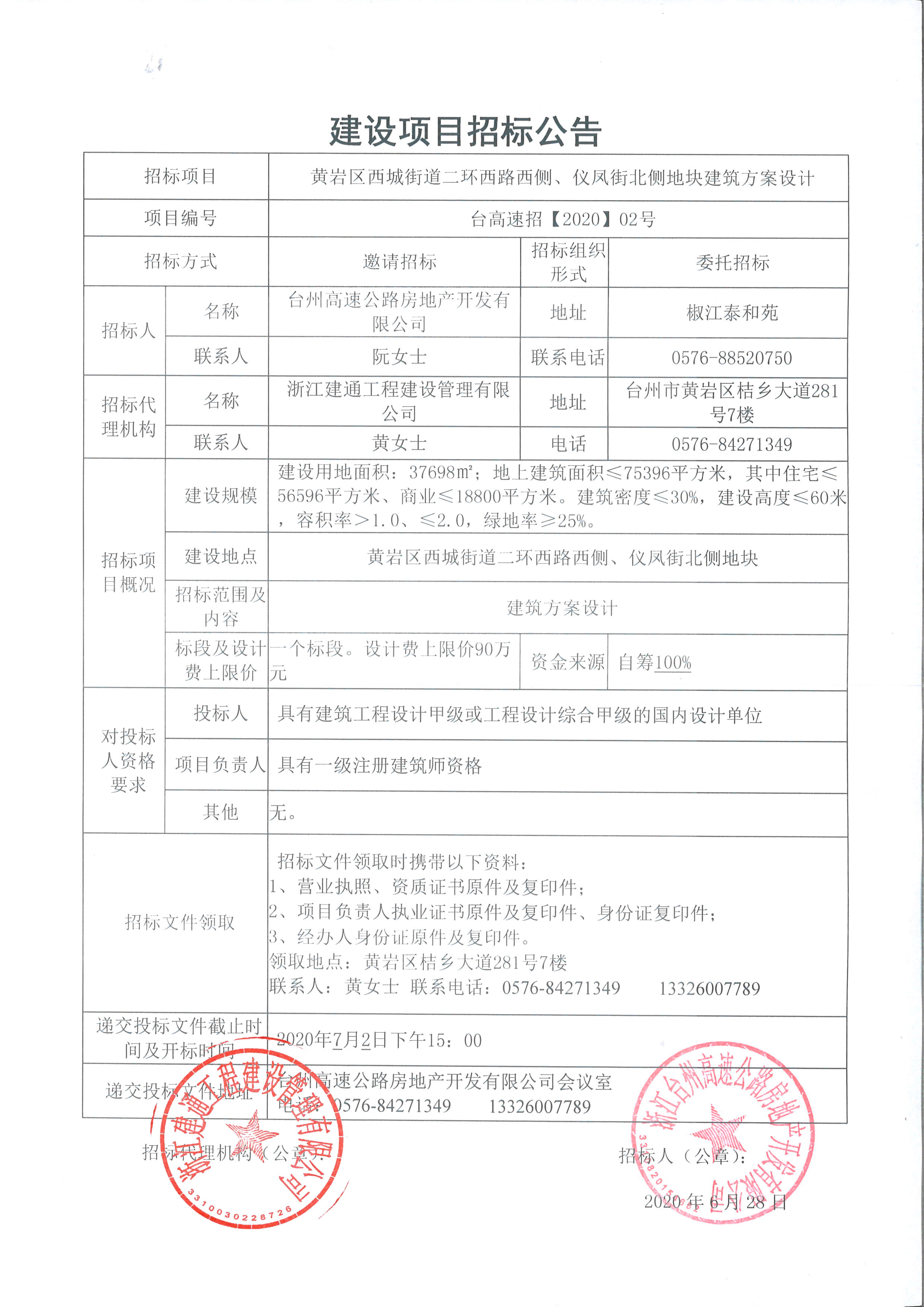 黃巖區西城街道二環西路西側、儀鳳街北側地塊建筑方案設計招標公告