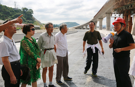 圖為在6#立交上了解工程建設(shè)情況 老干部一行實(shí)地踏勘了內(nèi)環(huán)路(黃巖段)各施工現(xiàn)場,全面了解了四個(gè)標(biāo)段工程當(dāng)前建設(shè)情況。一路上,老干部們一面聽取各標(biāo)段工作匯報(bào),一面用手機(jī)相機(jī)記錄現(xiàn)場當(dāng)前建設(shè)情況,當(dāng)知道今年11月11日內(nèi)環(huán)路將實(shí)現(xiàn)主線通車時(shí),老干部們紛紛豎起大拇指,為內(nèi)環(huán)路建設(shè)的進(jìn)度和質(zhì)量點(diǎn)贊,同時(shí)表示將多走多看,為內(nèi)環(huán)建設(shè)盡自己的一份力。 鐘彪對(duì)老干部們的關(guān)心和支持表示衷心感謝,并希望各位老干部多指導(dǎo)、多監(jiān)督、多提寶貴意見,助力臺(tái)州城市建設(shè)趕超發(fā)展。 張琛